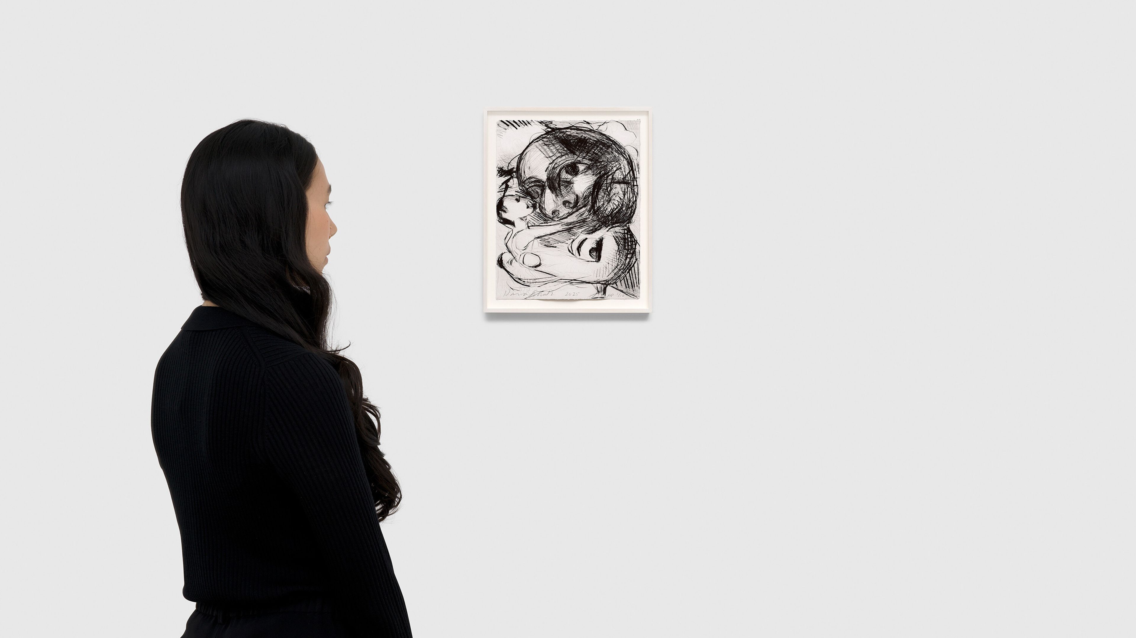 The artist's new etching, The Love (2025), relates to her painting from 2023 which bears the same title. The scene is intimate, with two figures seeming to dissolve into one another as they embrace. The large figure is atmospheric and malleable, like the drifting clouds behind her. In her palm, she cradles the smaller figure who reaches toward her in a gesture of longing.