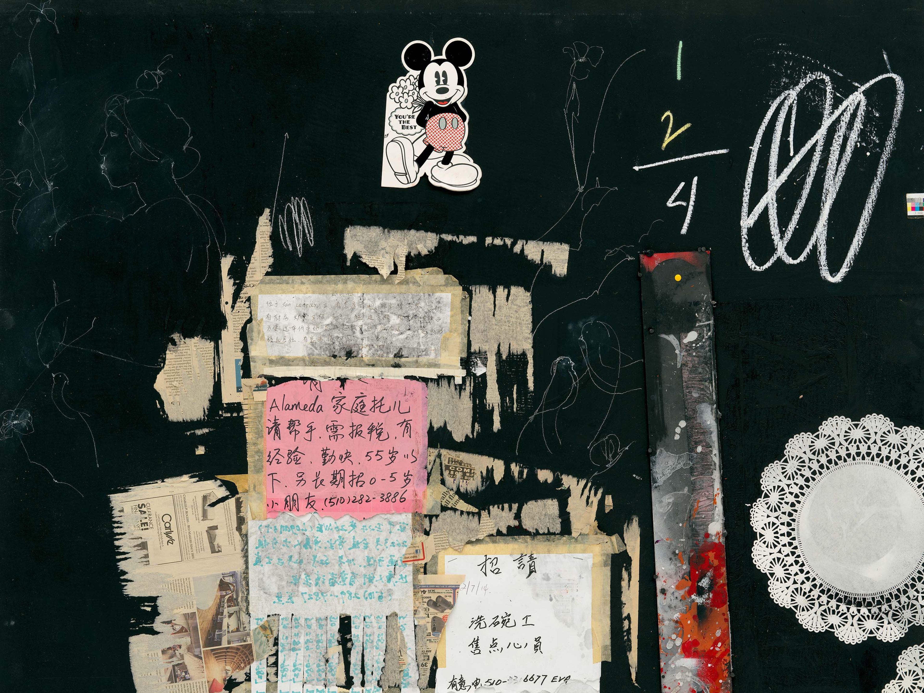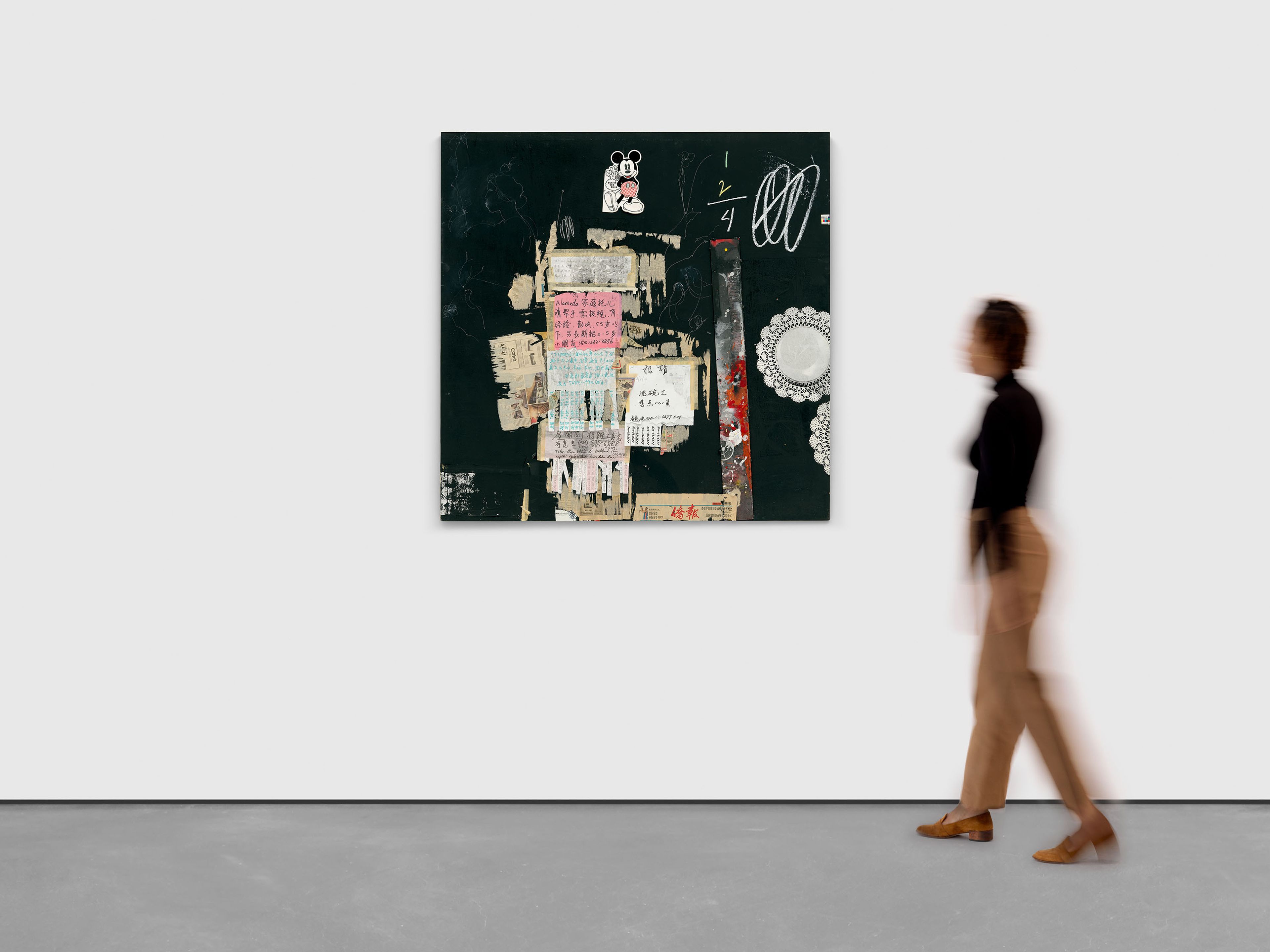 Acrylic, spray paint, chalk, collage, and mixed media on wood panel