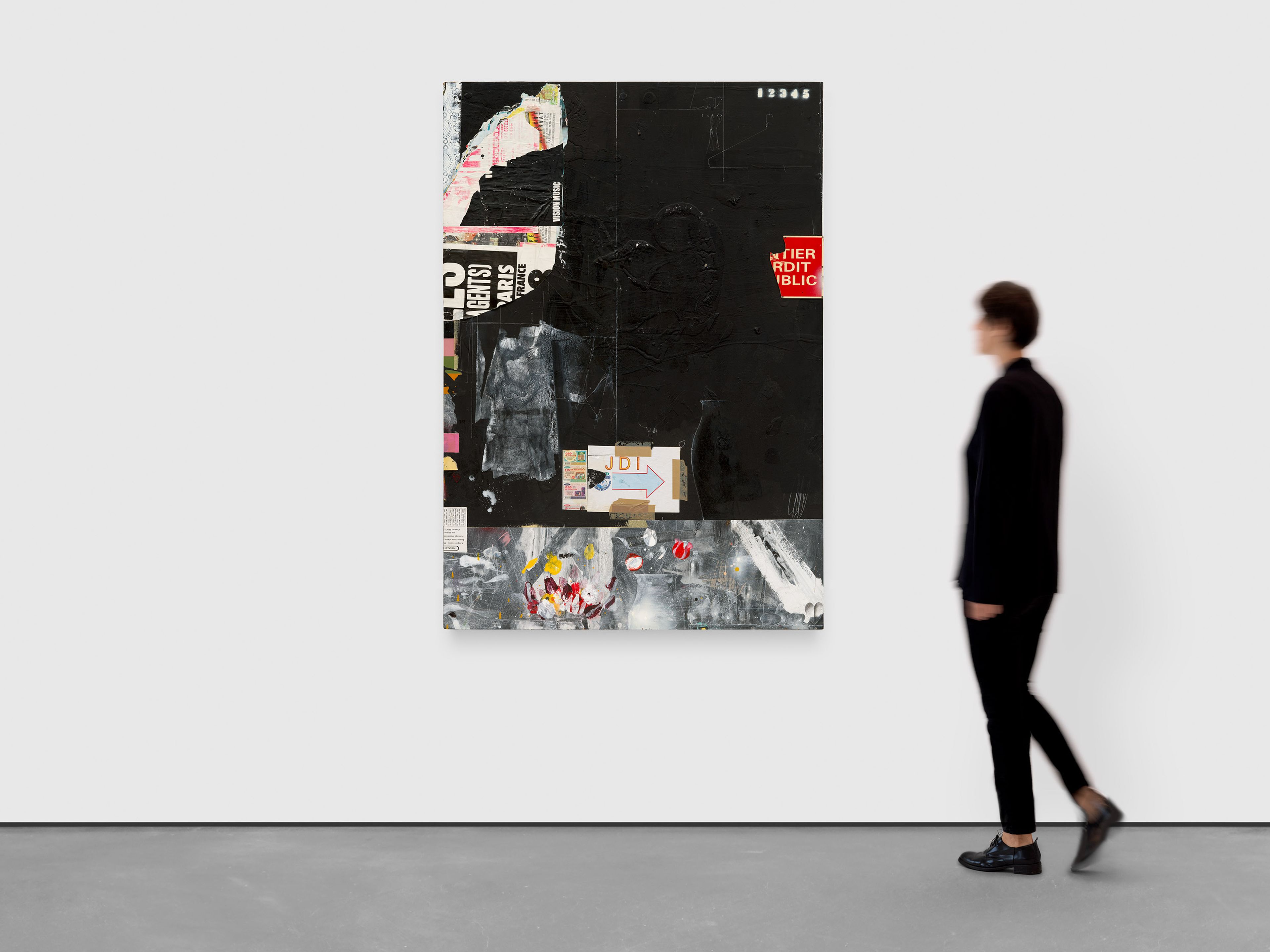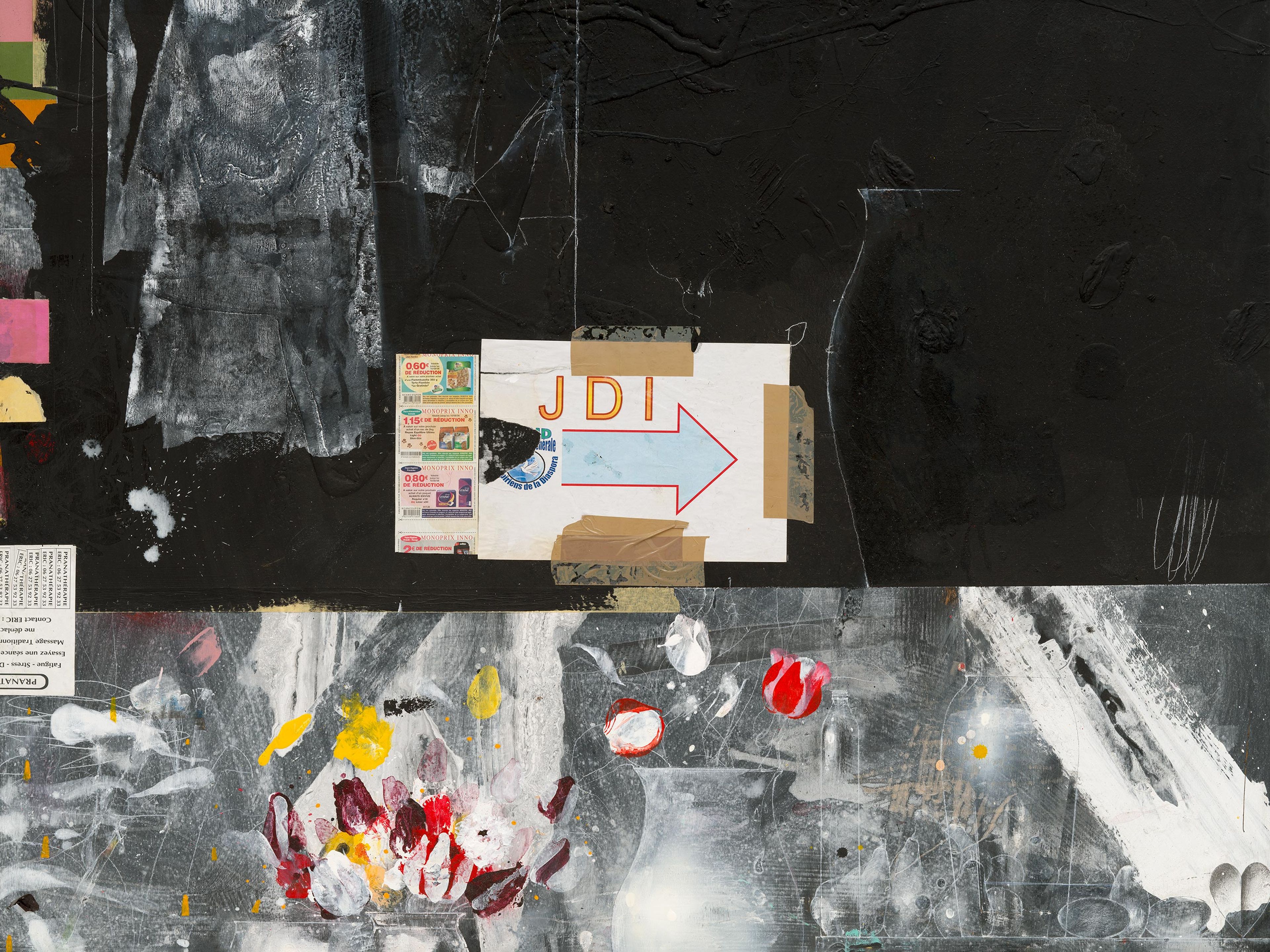 Acrylic, spray paint, chalk, collage, and mixed media on wood panel