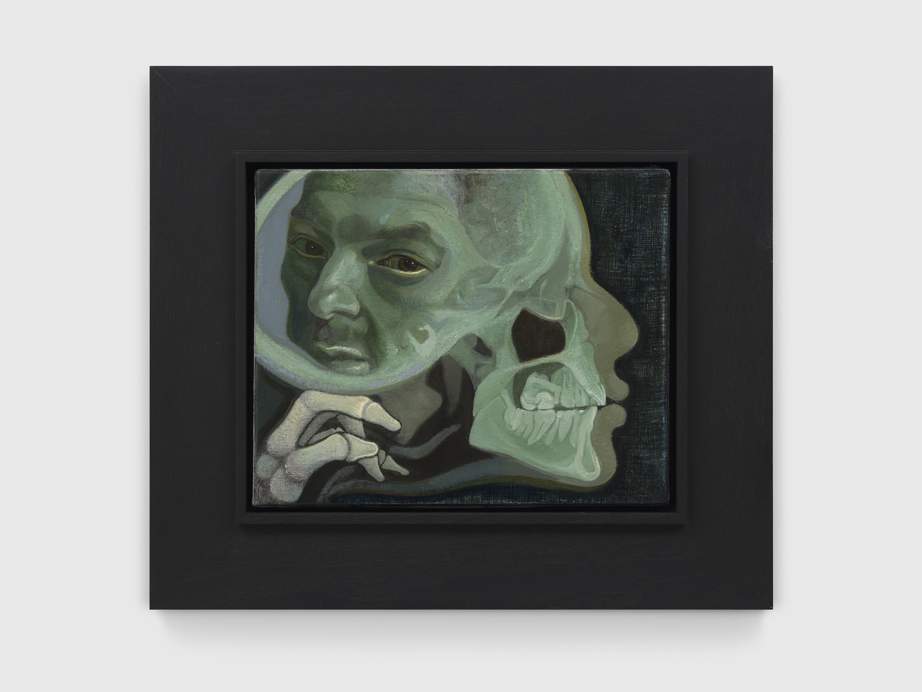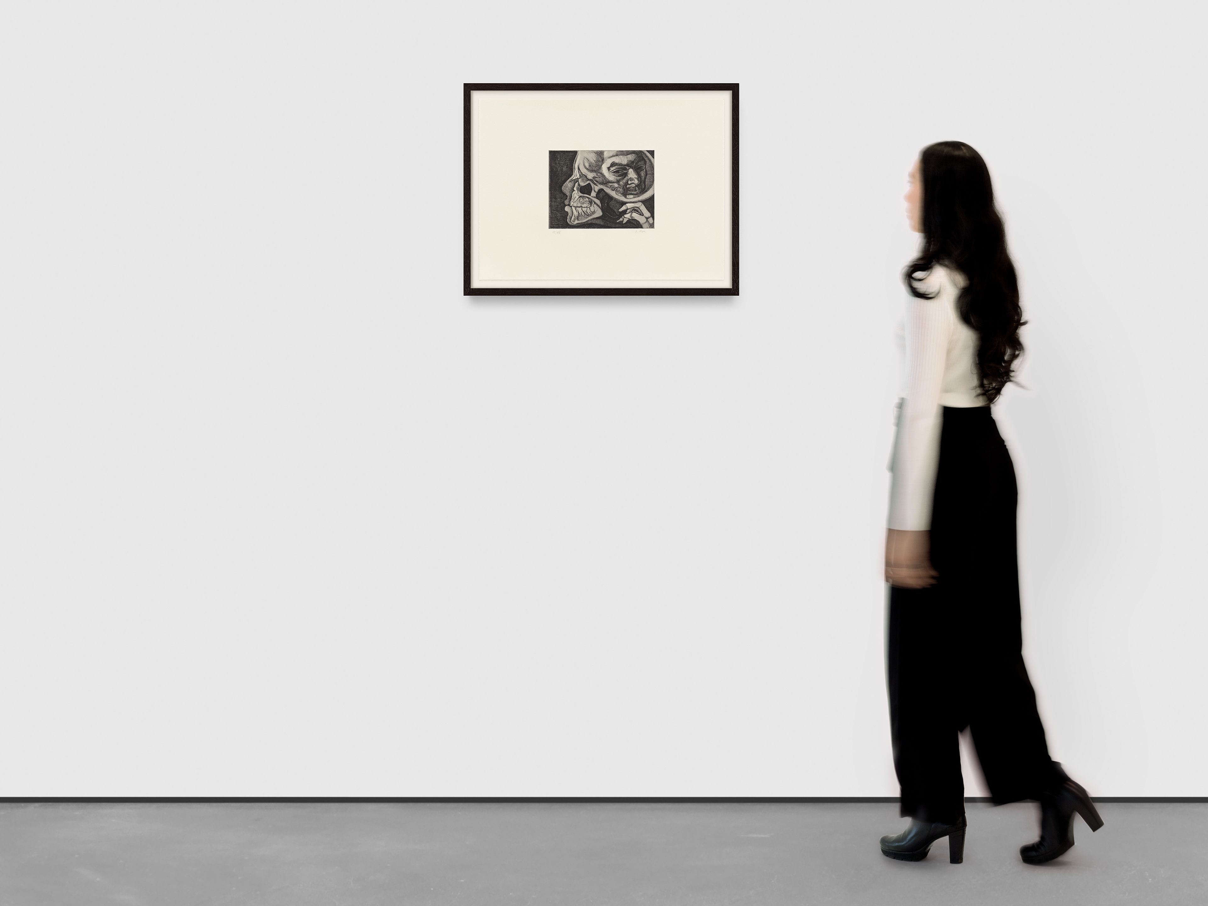In this work, we see a person in a person in a person, a cascade of masks entangled into one another, almost like the chain of relations in which life’s path unfolds. The print’s rich shadows and highlights capture the luminosity present in the related painting, dated 2024–2025. Both works bear the title Umbra Vitae, a phrase which could be loosely translated to “shadow of life.” Each exemplifies the artist’s use of self-portraiture as an autoreflective testimony of the individual’s journey through time, deeply intimate yet divorced from self-infatuation.