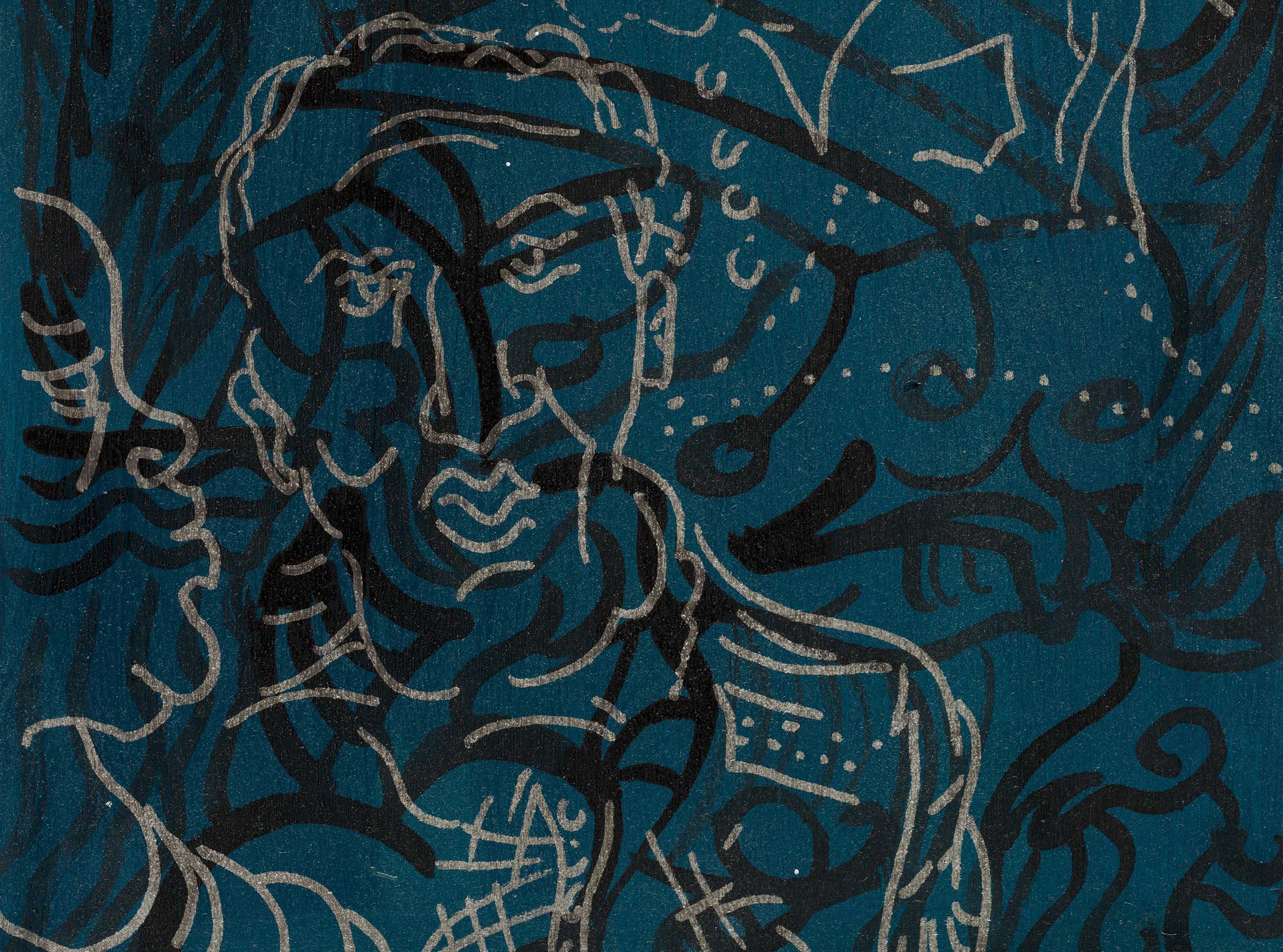 Ink, gesso, Flashe, and chrome pen on wood panel