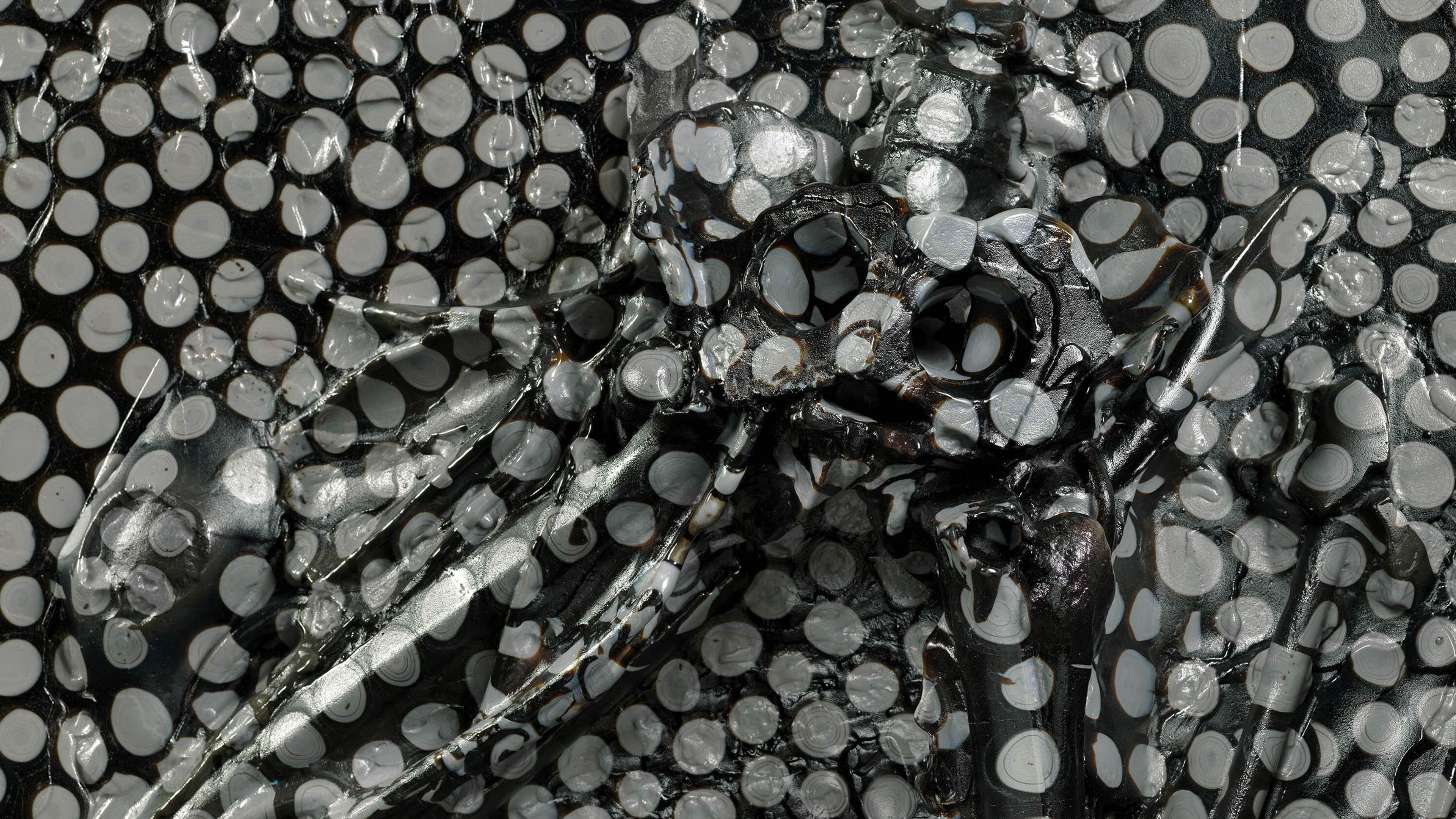In these works, the murrine produces dense papillary fields that echo the sudden proliferation of dots across vision at the moment of a retinal tear. Each figure appears in both translucent and opaque aspects, as if vision were oscillating between clarity and obscurity. These entoptic specters are embodied floaters, phosphenes, and drifting flashes that belong to the eye rather than the external world.