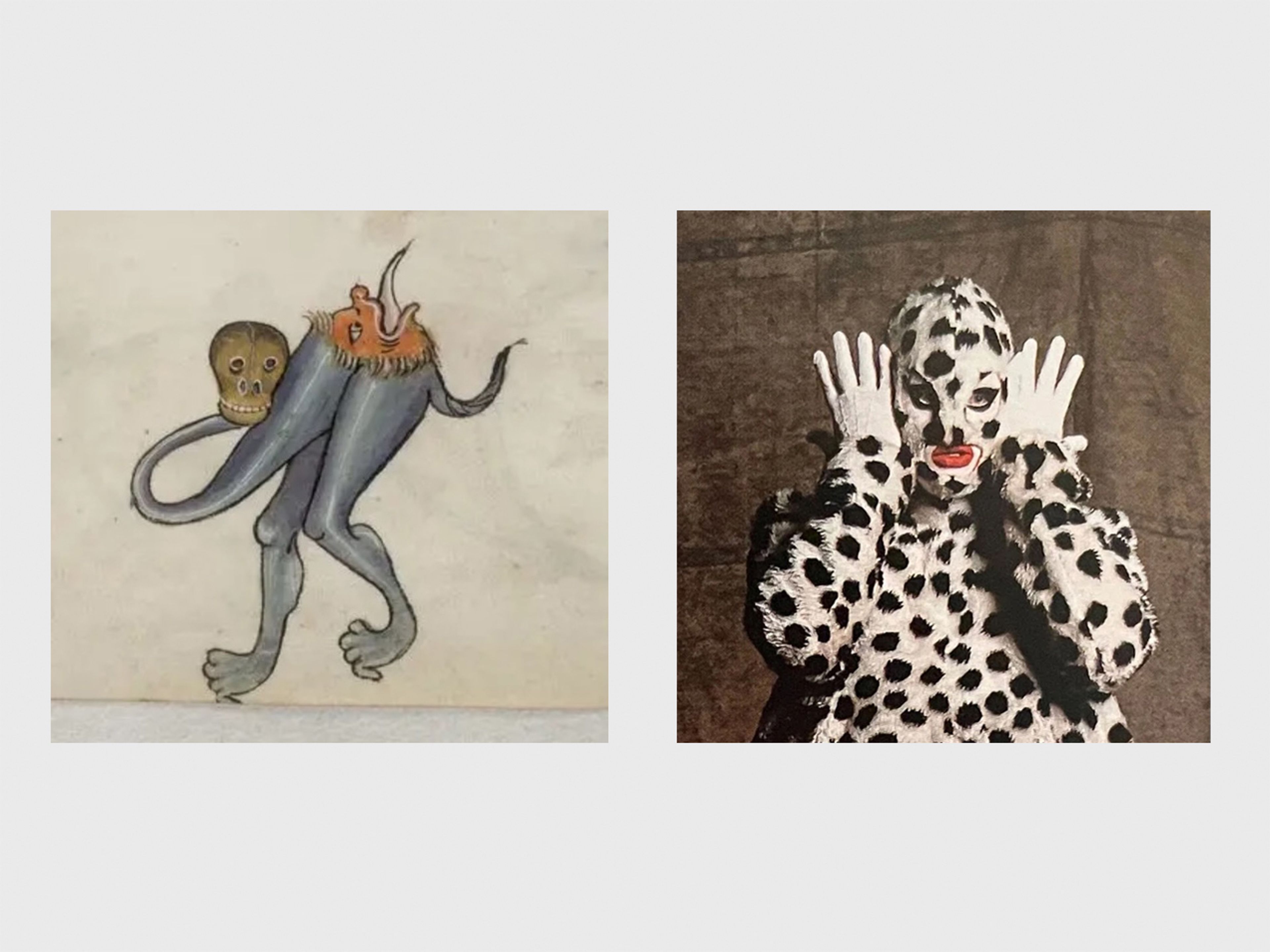 Left: Marginal decoration from the Luttrell Psalter, c. 1320-–1340 (detail). Collection of the British Library, London; right: Fergus Greer, Leigh Bowery, Session I, Look 1, 1988. © Fergus Greer