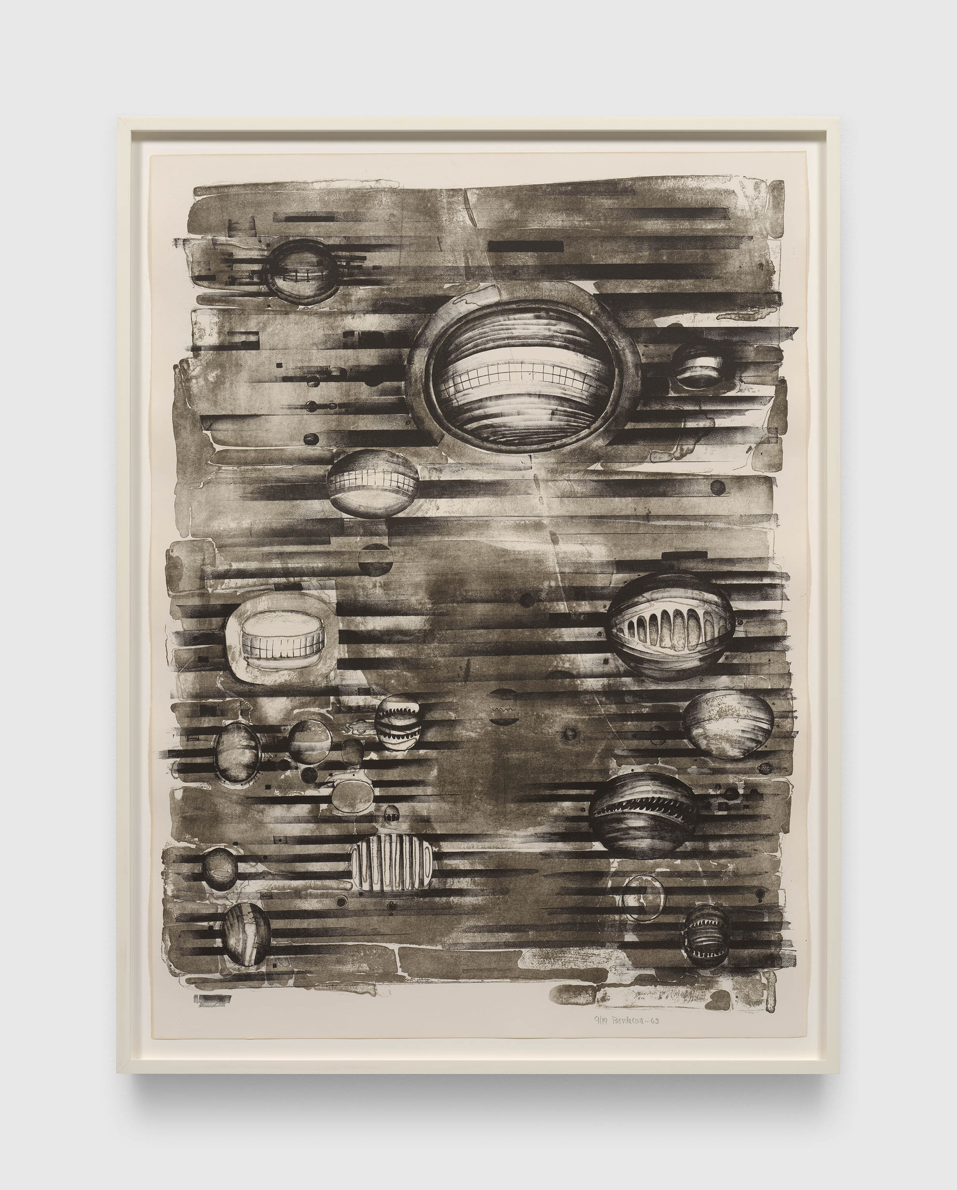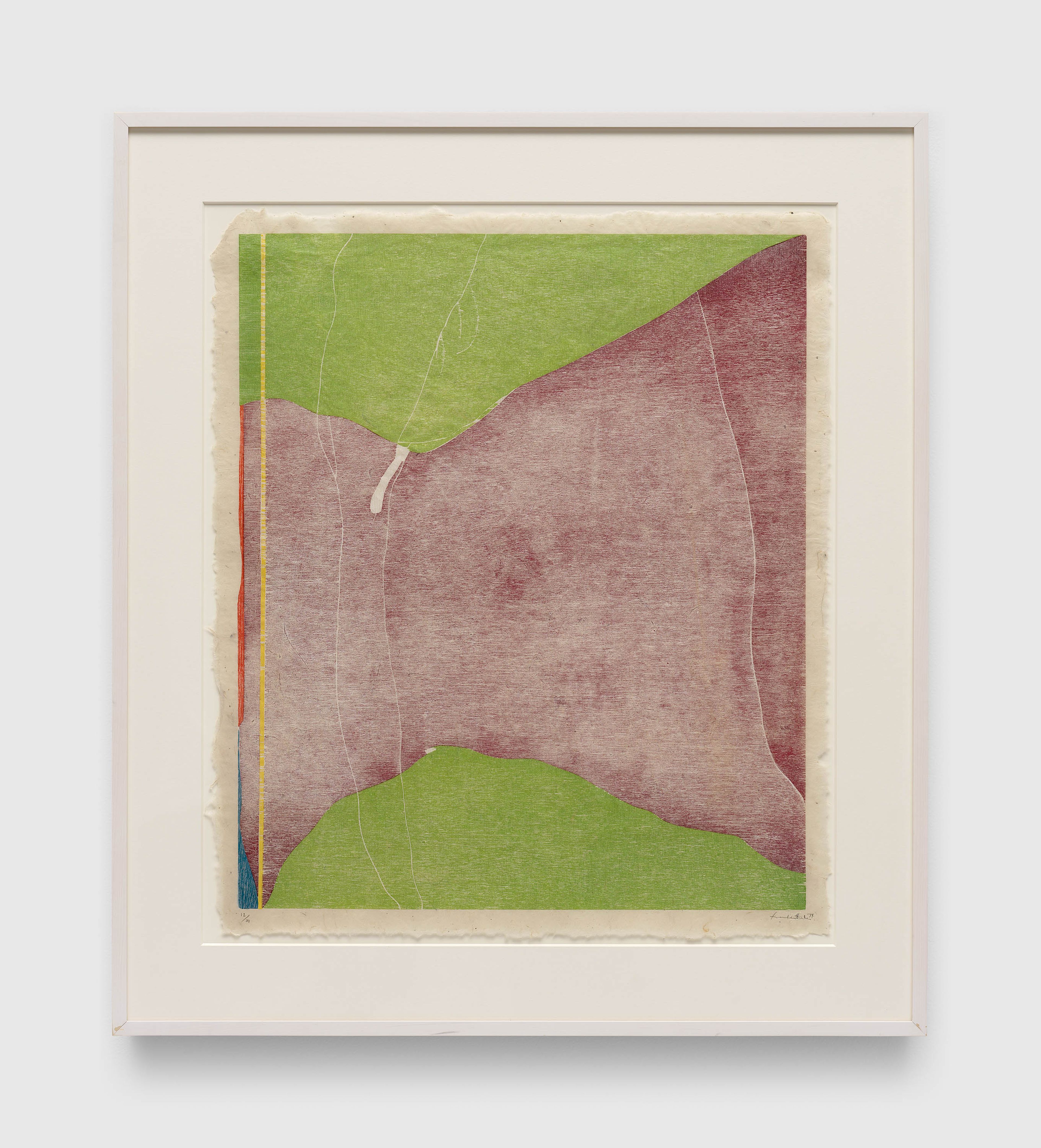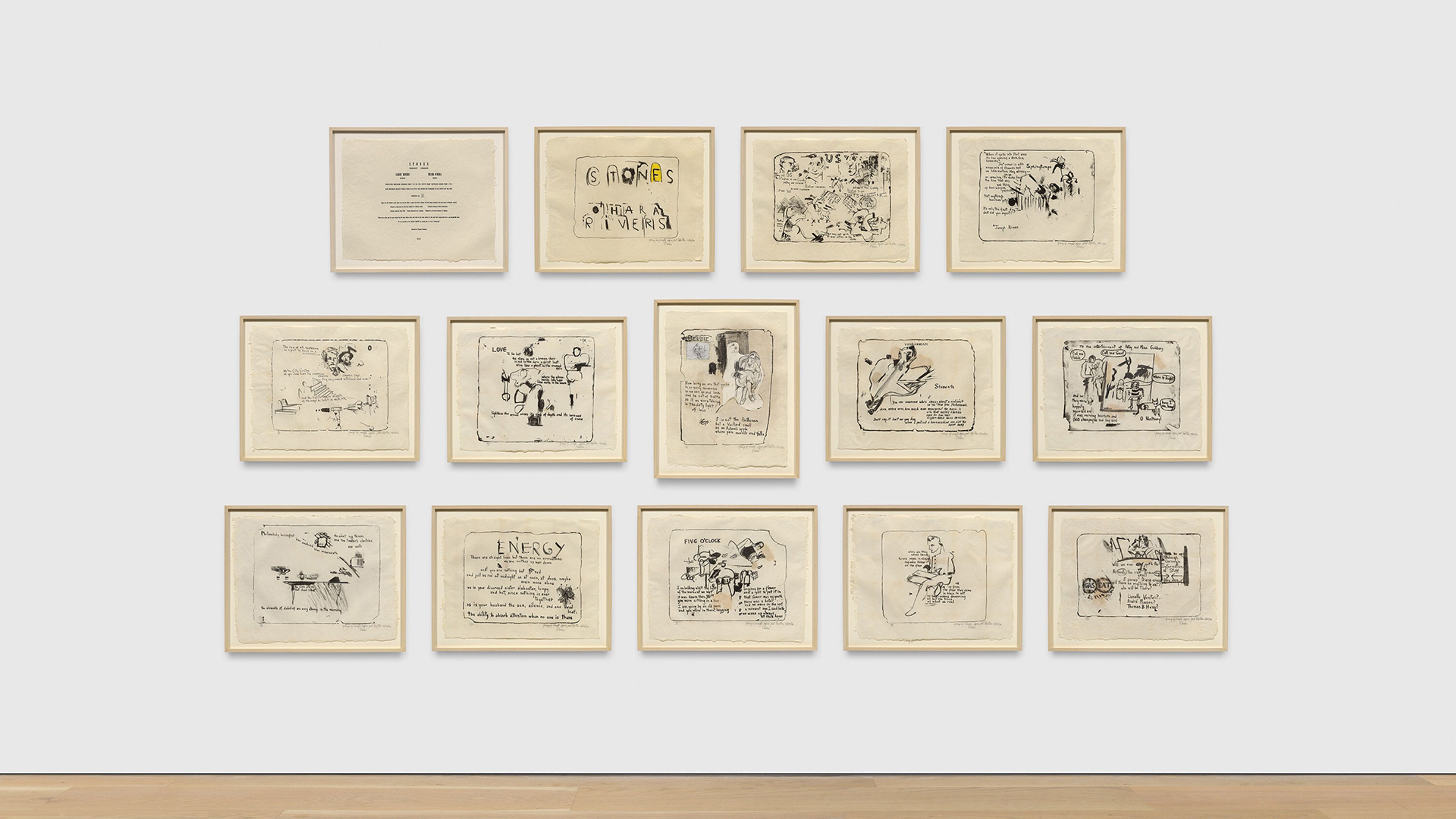 A selection of work from the late 1950s through the 1970s highlights ULAE’s earliest publications, which set the tone for the workshop’s creative ambition. The exhibition features a complete set of ULAE’s first publication, Stones (1957–1959), a collaborative portfolio in the spirit of the French livre d’artiste. The twelve lithographs feature original illustrations by Rivers and poems by Frank O’Hara. Inspired by his experience, Rivers encouraged other artists to print at ULAE, including Frankenthaler, Marisol, and Grace Hartigan, each of whom are represented here by works in a variety of processes spanning lithography, intaglio, and woodcut.