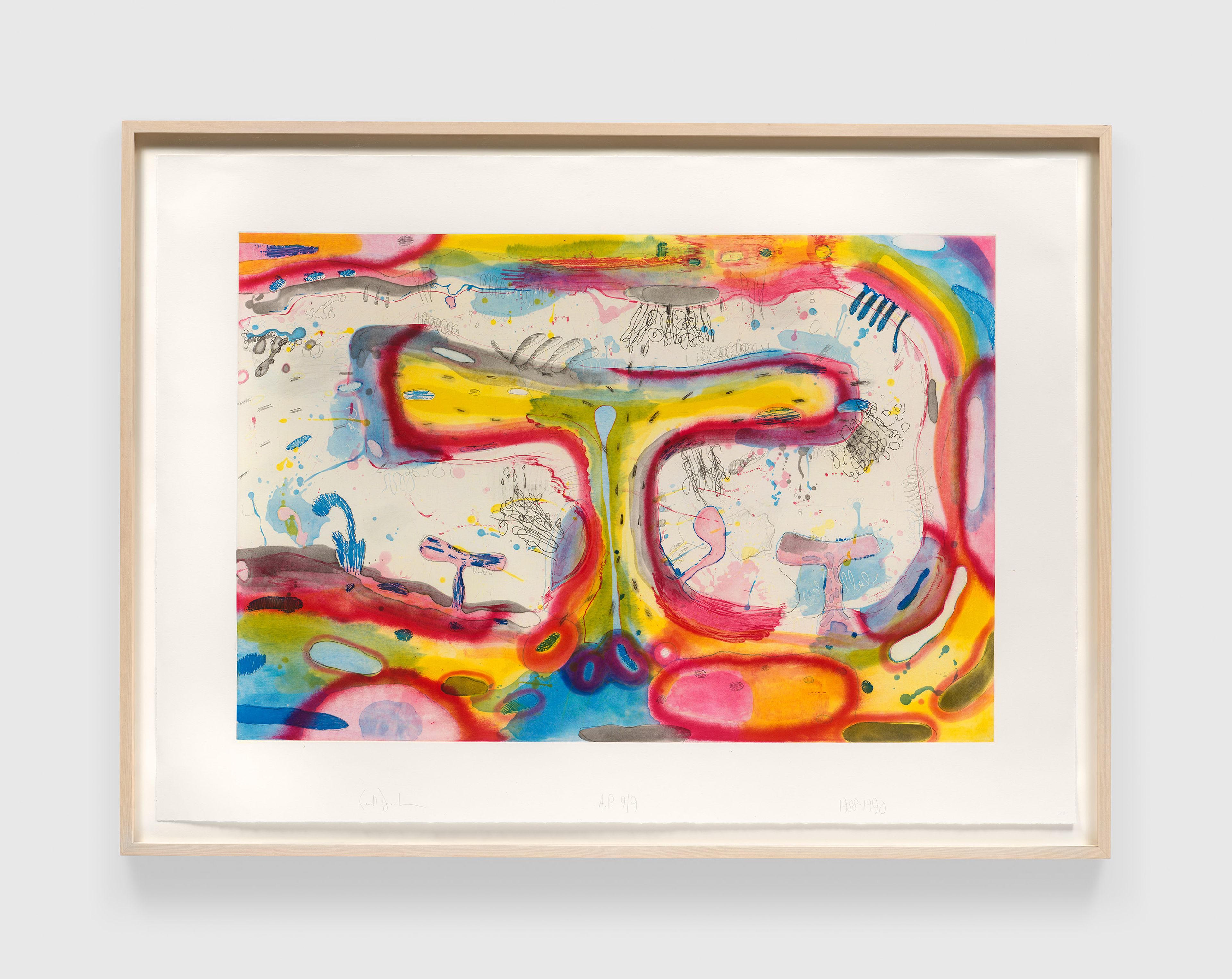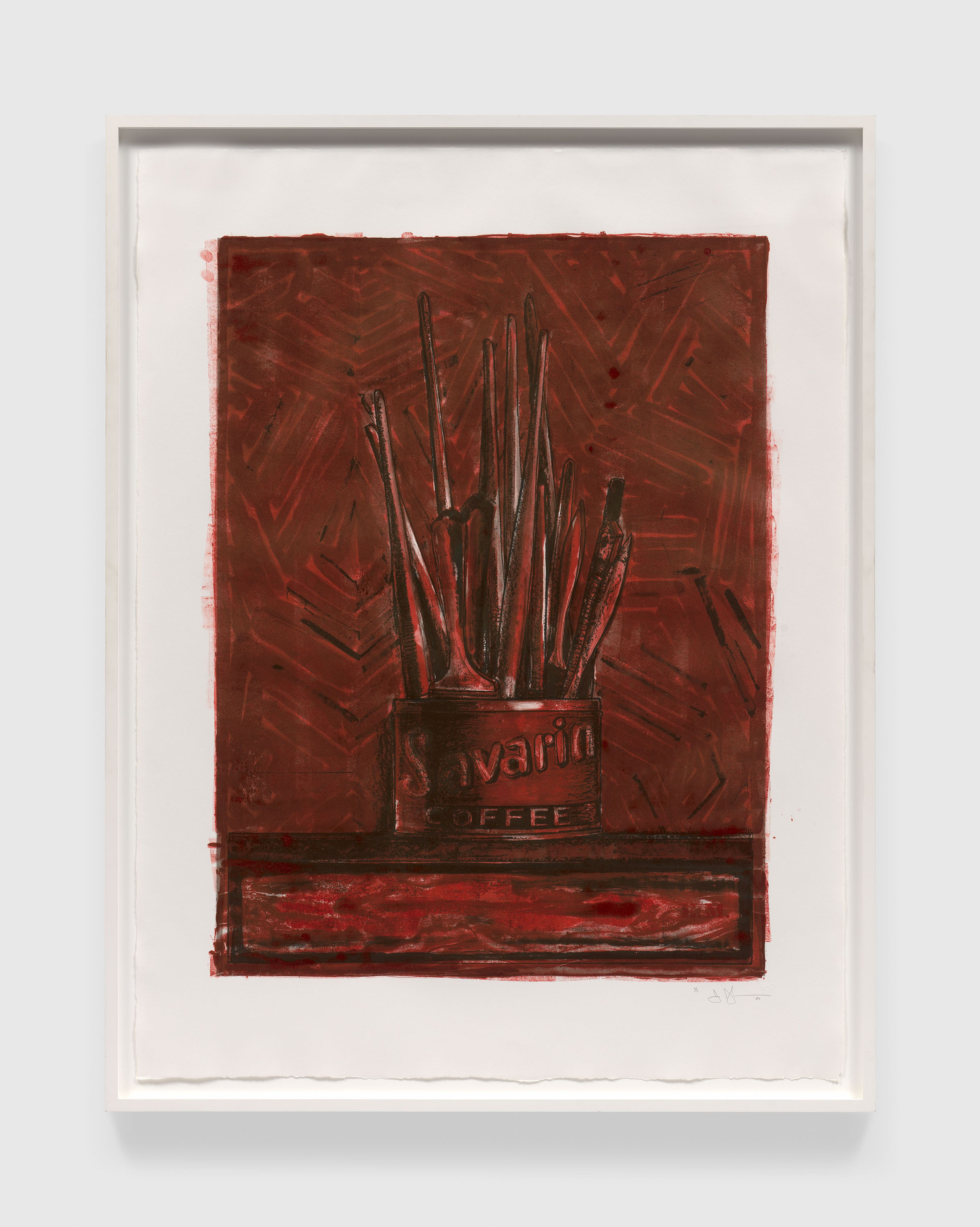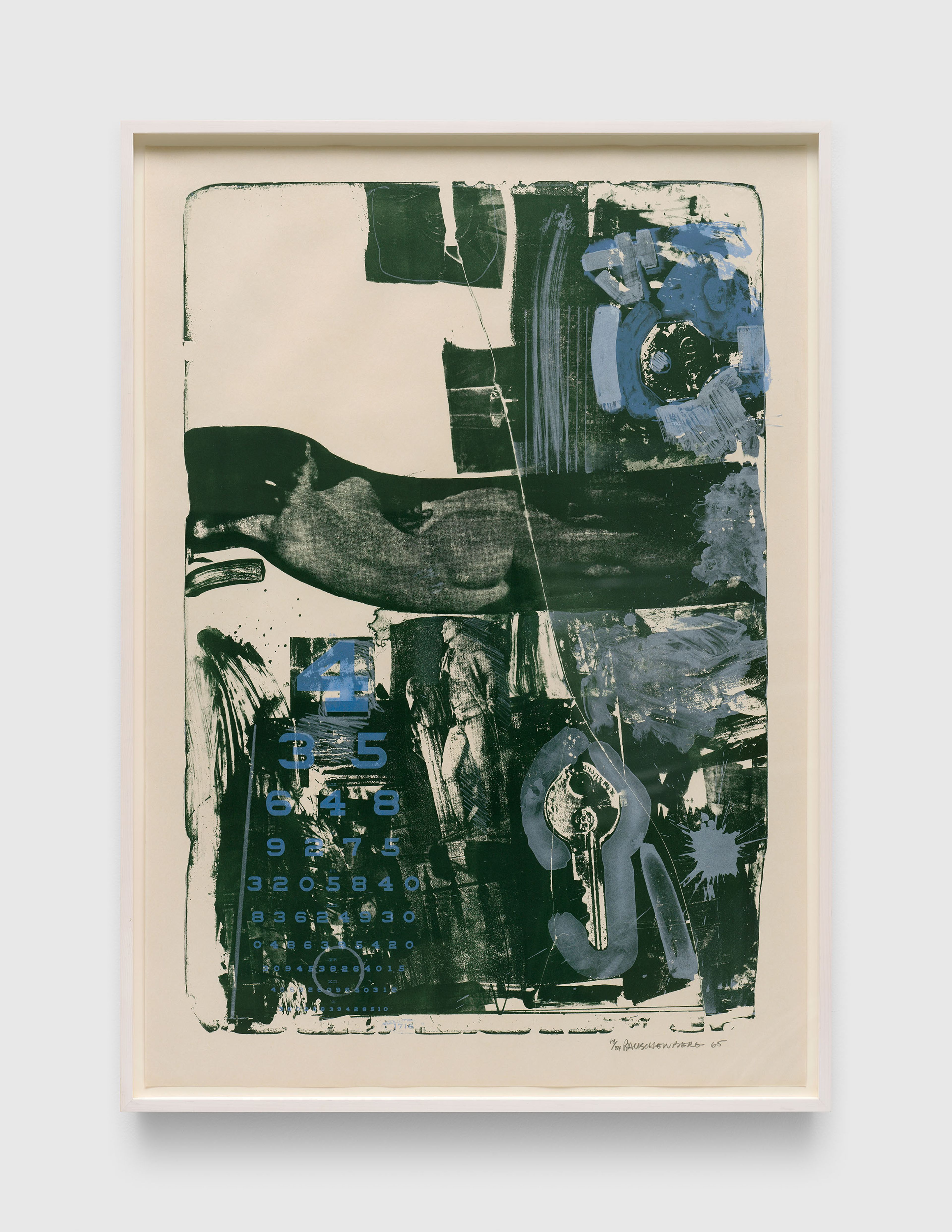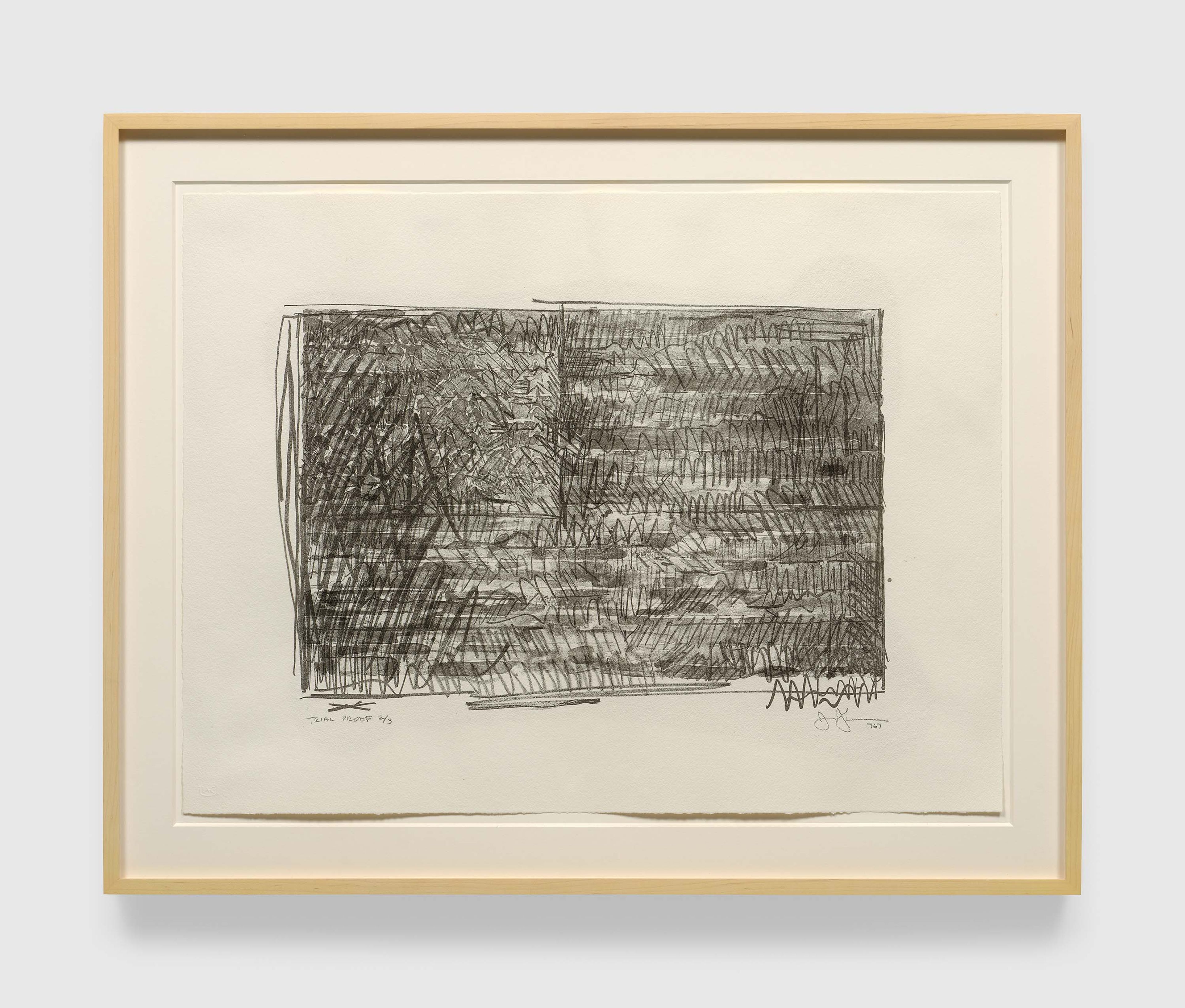 Among the earliest artists to work at ULAE, Johns developed a close relationship with Grosman and garnered wide recognition for the workshop, inviting many artists including Rauschenberg to make prints there. Johns has worked in a variety of techniques at the workshop since 1960, often reworking plates or drawing over proofs as he pushed the technical and conceptual boundaries of the medium. Formal concepts inherent to printmaking, such as repetition and mirroring, have become hallmarks of Johns’s broader practice.