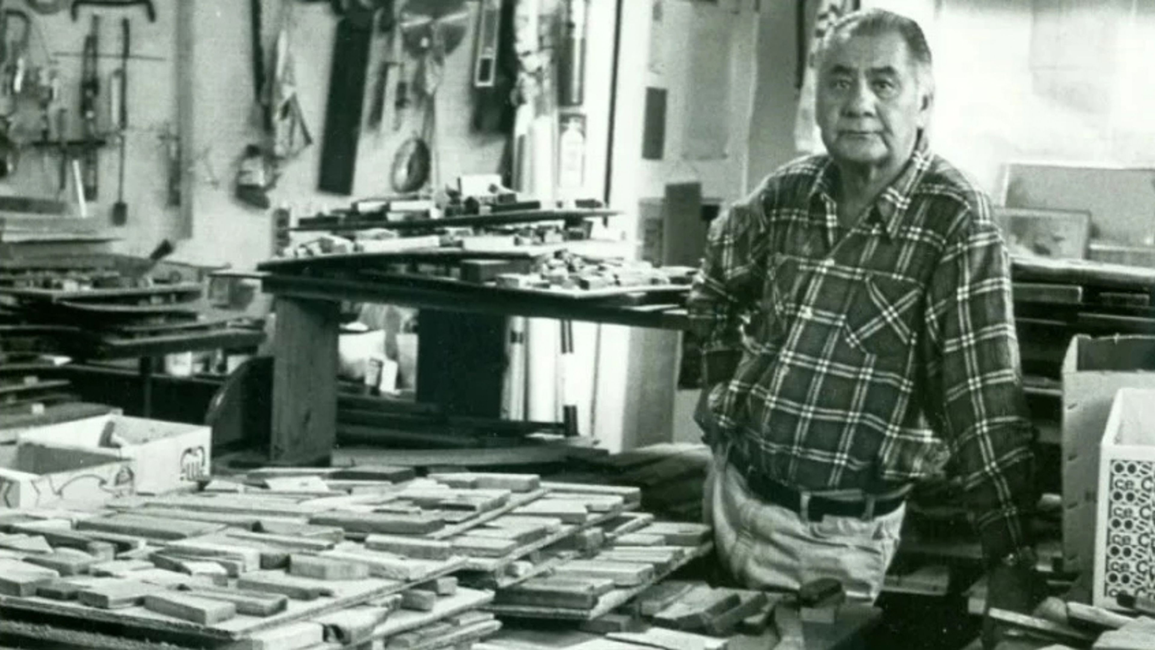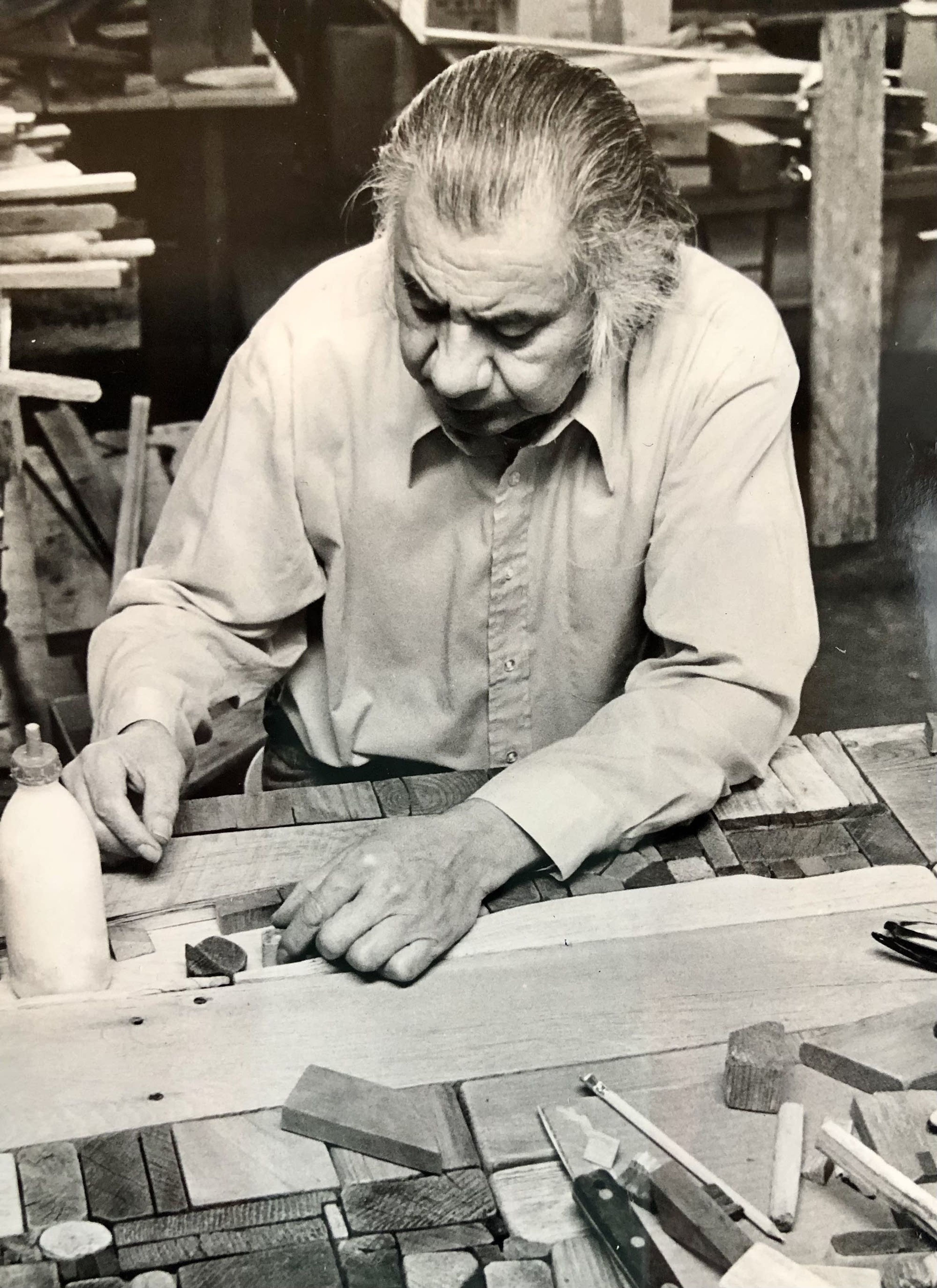 George Morrison at work on a wood collage in his Grand Portage studio. George Morrison Estate/Bockley Gallery