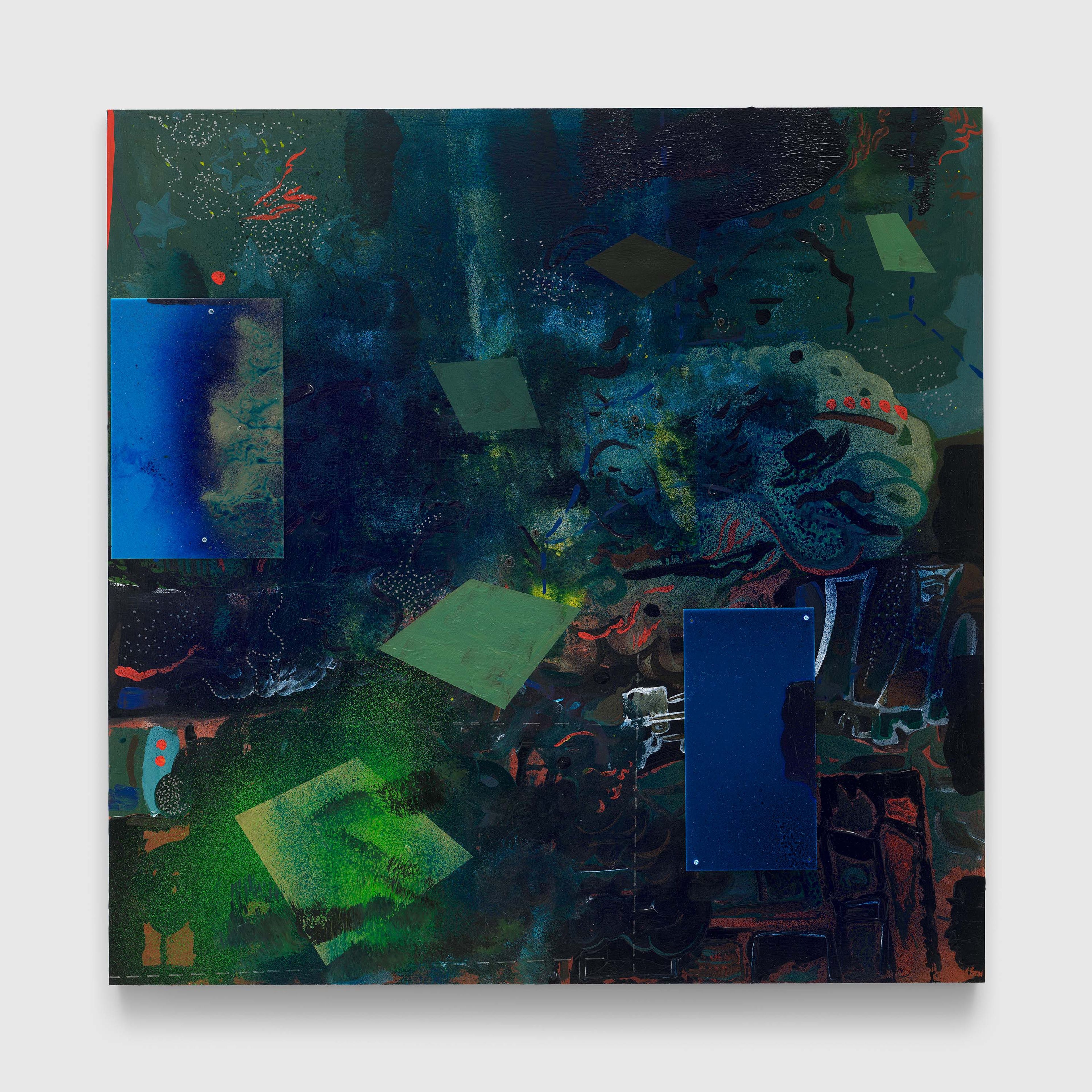 Acrylic, Flashe, gesso, PVC glue, and collage on wood panel